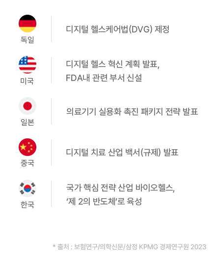 IMDRF(International Medical Device Regulators Forum)와 미국 FDA는 2013년부터 디지털 치료제를 소프트웨어 의료기기(SaMD)의 한 종류로 편입 · 관리하기 위한 규제체계 신설, 정식 의료 서비스로 제도적 정의